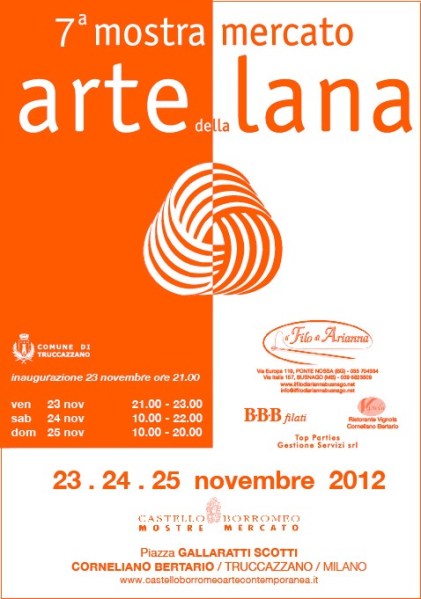 Mentre sarò impegnata nella presentazione romana, Laura Dell’Erba, la realizzatrice del filato usato per la sciarpa a occhiello, è presente da oggi alla mostra-mercato “L’arte della Lana” a Truccazzano, presso cui porterà anche alcune copie del libro. Quindi, se siete in zona potete andare a trovare Laura e compratemi. Qui sotto potete vedere la locandina della manifestazione con tutti i dettagli.