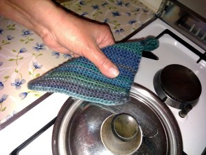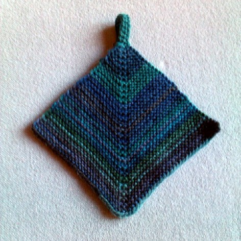 L’ho realizzata con un filato rigato che la rende visivamente più interessante, ma qualsiasi avanzo di filato (purché in pura lana, senza traccia di acrilico o cotone che possono facilmente prendere fuoco) abbastanza grosso può andare bene, ma fate attenzione a non esagerare o sarà impossibile appendere la presina con il «piccanello» troppo grosso. Per renderla più compatta in modo che il calore del manico della pentola non arrivi alle mani, ho lavorato il filato con un ferro più piccolo di quanto richiesto, fino a ottenere una texture quasi rigida.