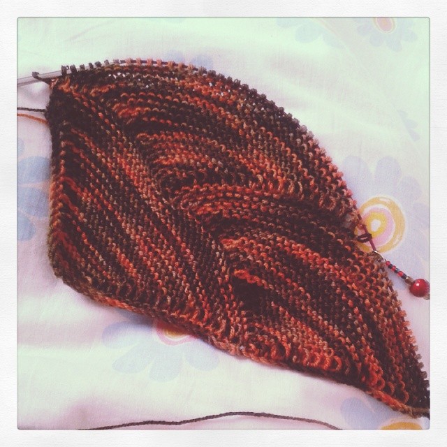 Fatto sta che, esaurita questa spinta maglionificatrice sono tornata ai miei accessori e ho avviato in parallelo uno scialle con una strepitosa lana e seta di WoolLisa, che però sulle punte in ottone nichelato dei KnitPro scivola troppo e penso che presto la passerò sugli Hiya Hiya (o magari ne aprofitterò per provare delle punte in bambù di KnitPro, o forse mi limiterò a mettere le punte in acrilico), e questa sciarpa interamente lavorata in sbieco a ferri accorciati con una matassa di pura lana sottilissima che mi ha donato Elbert Espeleta. Elbert ha centrato una conbinazione di colori che mette insieme molte delle mie tinte preferite e lo fai in modo armonico, ma soprattutto ha dato a questo variegato colori di lunghezza perfetta per esaltare al massimo la lavorazione a maglia anziché trasformarla nel classico vomito di gatto (o vomito di clown). Mi sento fortunata a vivere e lavorare a maglia in un mondo in cui esistono tintori abili come Elbert, come Lisa Russo e come Aogi Yoshizawa.