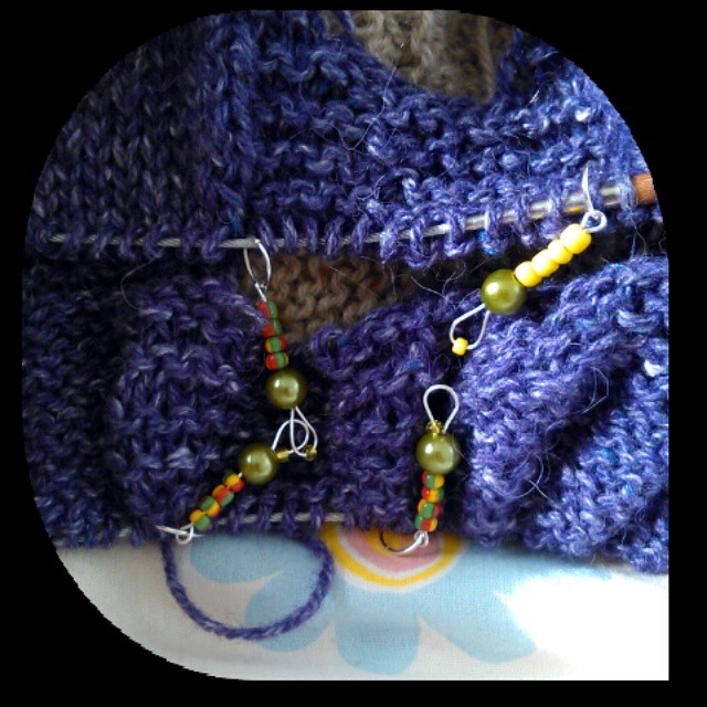 Vezzo dei vezzi, mi sono fabbricata un set di quattro marcapunti (tre più un solista che marca l’inizio giro) specifici perr questo lavoro, tutti in verde e giallo (con un tocco di arancione per varietà).