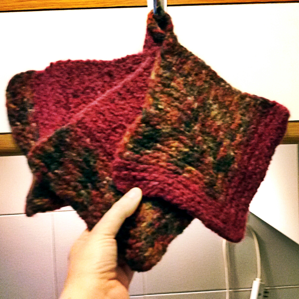 La nonna necessitava di presine, e io ho preso due gomitoli di lana da follare di Drops (Alaska) e le ho fatte. Tre bei quadratoni mitered con il piccanello ad I-cord lavorati con l’8. Decisamente troppo grandi e troppo rade, prima di essere follate!
