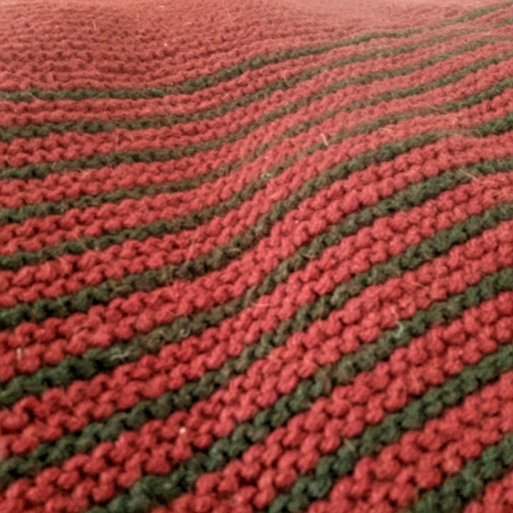 Poi sto lavorando a questa spianata di legaccio con qualche riga nella foto qui sotto, che sarà la mia sciarpona invernale. Questa non è così divertente, anzi. Dritto-dritto-dritto-dritto-dritto deqquà. Dritto-dritto-dritto-dritto-dritto dellà. Un aumento ogni tanto. Ma, suvvia, in metropolitana è perfetto.