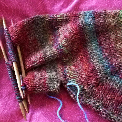 Quindi, mi sto facendo un maglionetto nuovo. La verità è che mi sono resa conto di avere una poderosa sezione del mio stash dedicata alla Felted Tweed DK di Rowan, per lo più comprata a botte di 1-2 gomitoli quando la trovavo in sconto, ma sempre nei miei colori. Colori che ricordo essere sangue di piccione, mattone, verde marcio, fanga, guano, depressione, e mestizia. Ho deciso di uccidere questa parte del mio stash frullando tutti questi colori assieme, ovverosia di farmi un maglione usando i filati due a due, mescolando i colori. L’idea di fondo è che se i colori fanno tutti parte di una palette coerente, quando li mescoli non può succedere nulla di male. E infatti per ora sta andando bene. Ogni pochi giri cambio uno dei due colori per ottenere l’effetto vagamente gradient. Non avrò ottomila codine da nascondere alla fine perché unisco i colori con il metodo spit-splice. E ovviamente sto lavorando il maglione top down per avere il massimo del controllo sulla quantità di filato usata.