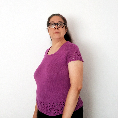La leggera sciancratura, lavorata solo sul dietro, e la sagomatura del seno variabile (è possibile scegliere tre diverse opzioni) donano alla maglietta una forma personalizzata. Malvarosa è lavorata a scendere dal collo con scollo quadrato e maniche a raglan. Le maniche corte sono lavorate in piano e hanno una breve cucitura all’interno.