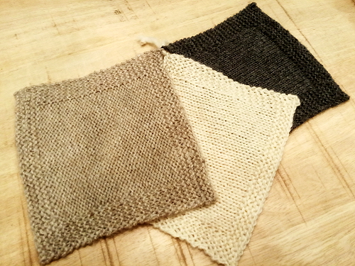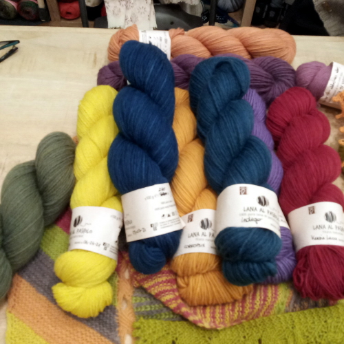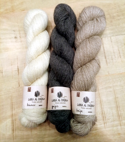 I filati che ho palpicciato ieri sono Romeo, un voluminoso stoppino semicardato, e Giulietta, un pettinato ritorto. Entrambi questi filati sono disponibili in tre pesi e anche tinti con pigmenti naturali. È da notare che la versione tinta ha una lunghezza per matassa (a parità di peso) un po’ inferiore a quella naturale, dato che la lana non viene stirata dopo la tintura. Il terzo filato della famiglia è Bas, una soavissima mescola di lana Brogna, alpaca locale e seta, questa volta proposto solo in versione naturale (che sfrutta i colori del vello di alpaca) e in un unico peso.