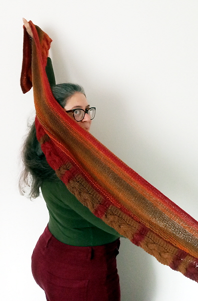 La stola è lavorata con un unico gomitolone di Varanasi, il filato stoppino di Katia specifico per scialli. Nonostante sia un misto acrilico, è estremamente morbido e ha una mano ricca e delicata. I rapidi cambi di colore aggiungono interesse comportandosi in modo radicalmente diverso nel bordo a treccia e nel centro a legaccio. Può essere indossata come una sciarpa attorno al collo o come una stretta ma lunga stola, a complemento di un cappotto o di un look da portare in interni. I colori del filato garantiscono l’apporto di luce e allegria alle giornate più fredde dell’inverno, mentre la leggera curva aiuta a indossarlo confortevolmente attorno al collo.