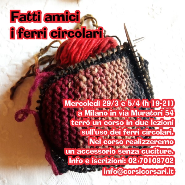 Chi mi segue sui social forse saprà già che questo inizio d’anno è stato singolarmente complesso, ma ora torno all’attività piena con una bella scarica di corsi primaverili. E iniziamo con questo che mette in primo piano i ferri circolari!
